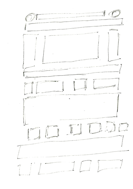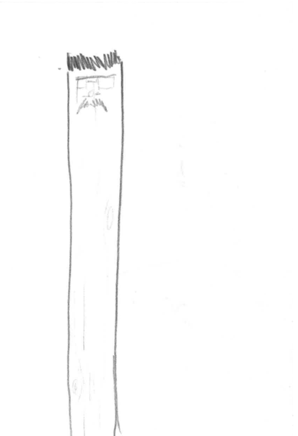 Leunend tegen het werk staat een afgedankt frame. Een frame of raamkozijn gemaakt uit het goedkoopste hout van den Brico. Het hout is groen, ademt en buigt. Er is een spel met de horizontale balken. Er zijn er die door de centrale balk lopen en er zijn er die ertegen aan botsen. Wanneer ze botsen en de horizontale dus in twee wordt gedeeld, schuift de linkse balk een beetje naar onder. Zo staan ze niet meer gelijk met elkaar. Het botsen en doorlopen wisselt zich af. Je krijgt een doorlopende balk gevolgd door een botsende balk waarvan het linkse deel telkens naar onder wordt geschoven. De middelste balken zijn dikker dan de andere balken. Er zijn geen spitsbogen, moesten die er wel zijn was mijn concept duidelijker. Je zult ze in je verbeelding moeten toevoegen. Het frame of kozijn is eigenlijk een schets voor een idee, een schets voor een structuur van een glasraam.