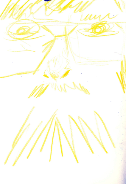 Een kop staat hier afgebeeld, Khalil ‘s portret. Vier bollen en drie kiekens dat zijn zeven elementen in totaal. Wordt het laatste avond maal hier herschikt? Twee kippen draaiend aan het spit en een derde kant en klaar op een porseleinen bord. De hangende kippen zijn gezet op een ander papier, ze krijgen hun eigen afbakening. Ze zijn gezeefd of gedrukt, ze zijn ingesmeerd en gedrukt. Vier grote bollen, geel en wit, staan onder elkaar. Eén gele bol vibrant fel, een andere dof en ingetogen. Twee vibrerende witte bollen. De bollen staan altijd in paren naast elkaar geel wit, geel wit. De onderste een vogelnest of een kippennest? Tussen de obsessieve lijn- voering, gevangen of beschermt. De bovenste gele bol zwevend tussen opgeborgen sporen, opgeborgen lijnen door vele lagen uitgedunde witte acryl, die nu beige doorschijnen. De bovenste witte bol ondergedoken in een ander papier vlak. Khalil ’s uitgesneden neus is onherkenbaar. Khalil is onherkenbaar.